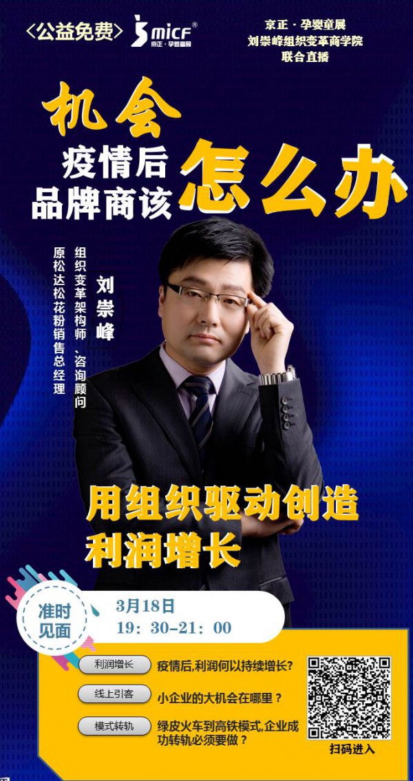 京正·孕嬰童展直播第一講即將開啟~時間:3月18日(周三)19:30【直播主題】《疫情彎道超車的新風口,用組織驅動創造利潤增長》【直播導師】劉崇峰組織變革架構師、咨詢...