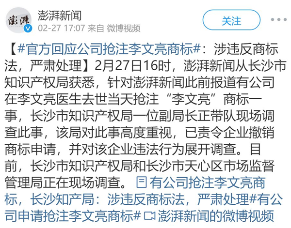 前不久發(fā)生一件惹眾怒的事:李文亮醫(yī)生才去世,就有公司當天搶注“李文亮”商標。 這是人干的事嗎? 2月27日,長沙市知識產權局責令企業(yè)撤銷申請,并且已...