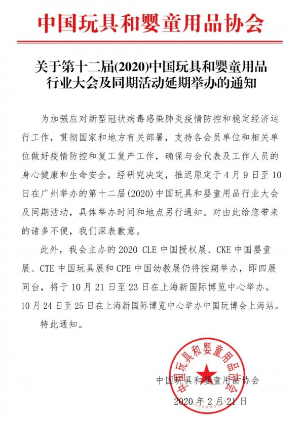 鑒于目前疫情防控和穩(wěn)定經(jīng)濟運行工作的要求,經(jīng)研究決定,推遲原定于4月9日至10日在廣州舉辦的第十二屆(2020)中國玩具和嬰童用品行業(yè)大會及同期活動。通知全文如下:...