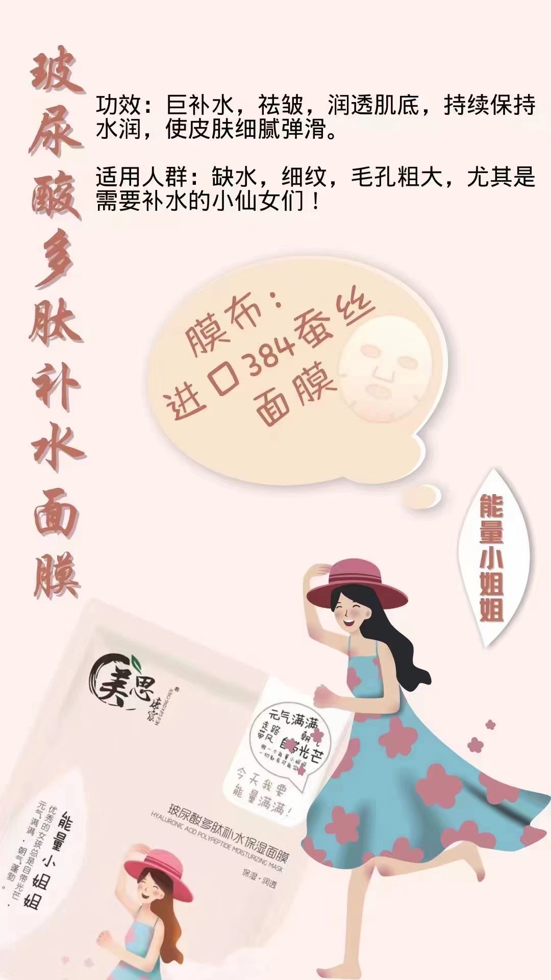 美思康宸氣質姐姐系列面膜 訂購熱線:13539456152微信同號 15703928831 官方全國總代,廣東、河南多倉發貨。全國包郵。 留言信箱:petergreen@163.com 美思康宸氣質姐姐系列面膜 用料:采用天然蠶絲薄膜,比無紡布更具彈力和韌性,可以自由拉伸調整尺寸,無論小臉還是大臉,都能照顧到肌膚的各個角落,完美貼合肌膚輪廓。 成分:富含各種營養成分,能夠潤透肌底,增強皮膚彈性,讓皮膚倍感水潤。 小姐姐系列面膜四大款: 1. 玻尿酸多肽補水保濕面膜 主打補水