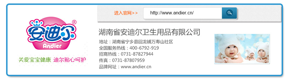 湖南省安迪爾衛生用品有限公司源于湖南省寧鄉縣長樂衛生用品廠,成立于1995年,是一家集研發、生產、銷售為一體的現代化新型企業。針對于人口眾多的中國市場,2012年安迪爾斥資在湖南寧鄉設立中國總部,引進香港最新育兒理念,新增全自動高速嬰兒紙尿褲生產線一條,紙尿片生產線一條,年生產能力過億元。公司現有各類技術人員36名,高級營銷人員29名。