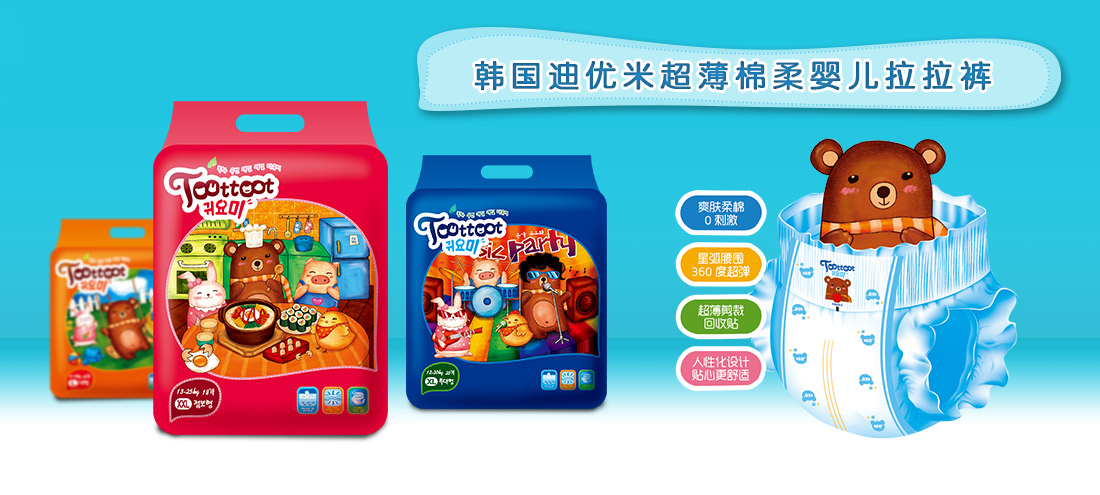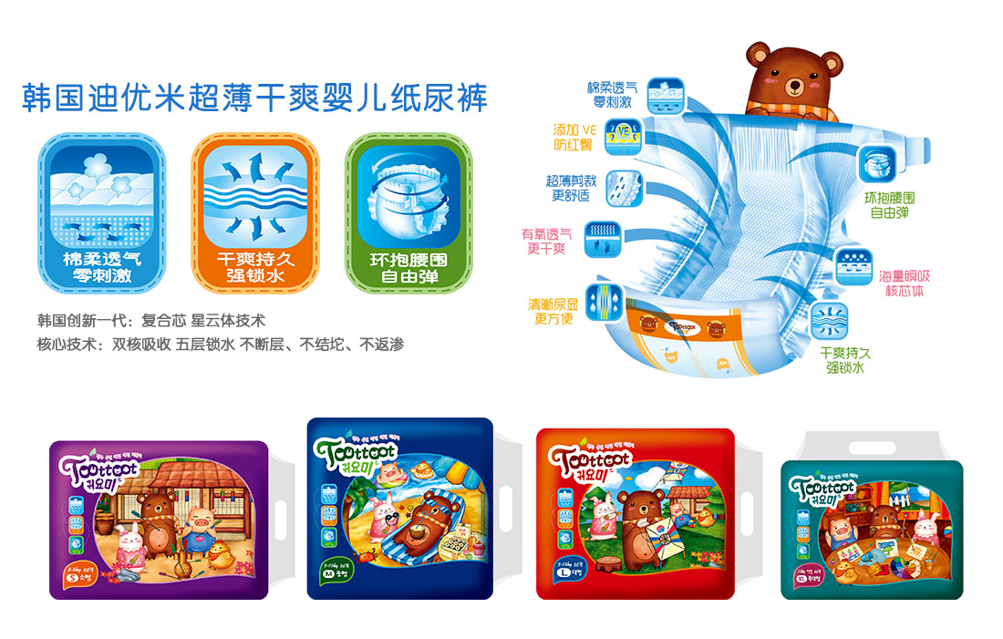 專屬形象:韓國特色的卡通動物形象獨有設計,尿褲外觀卡通形象、場景式外包裝,親子益智,快樂成長。
