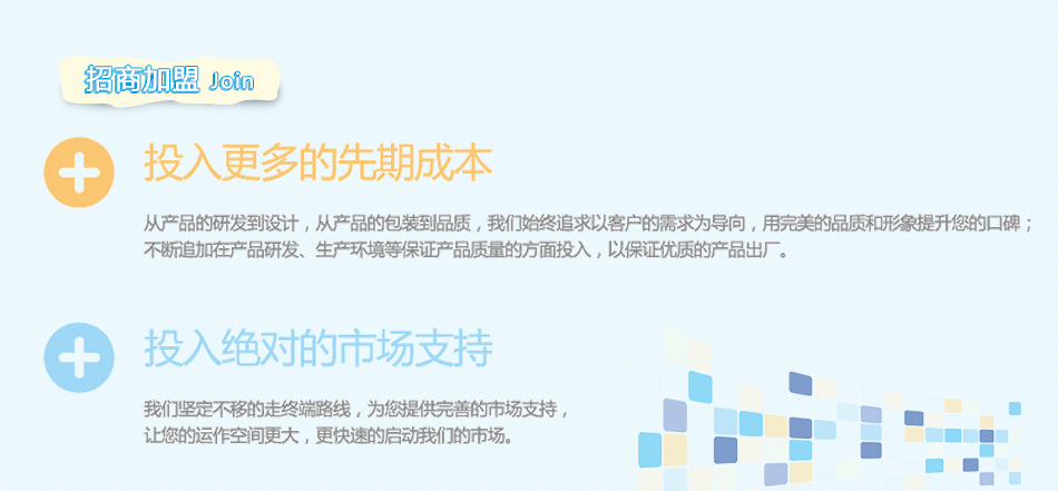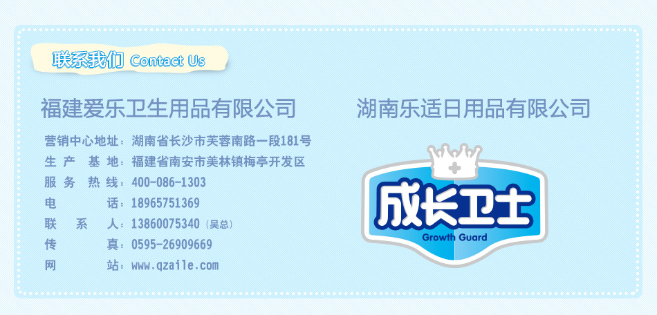 湖南樂適日用品有限公司于2012年成立,并于2013年初與愛樂衛生用品有限公司結成戰略合作伙伴關系,共同致力于“成長衛士”品牌的打造。通過“為未來而來”的創新運營模式打造“成長衛士”親和友善、年輕活力、聰明睿智的品牌內涵。憑借產品差異化及優良的性價比,以獲未來長遠的發展。隨著不斷豐富的產品組合以及將會逐步擴大的網絡,“成長衛士”將為期待未來美好生活的消費者提供更多選擇和生活享受。