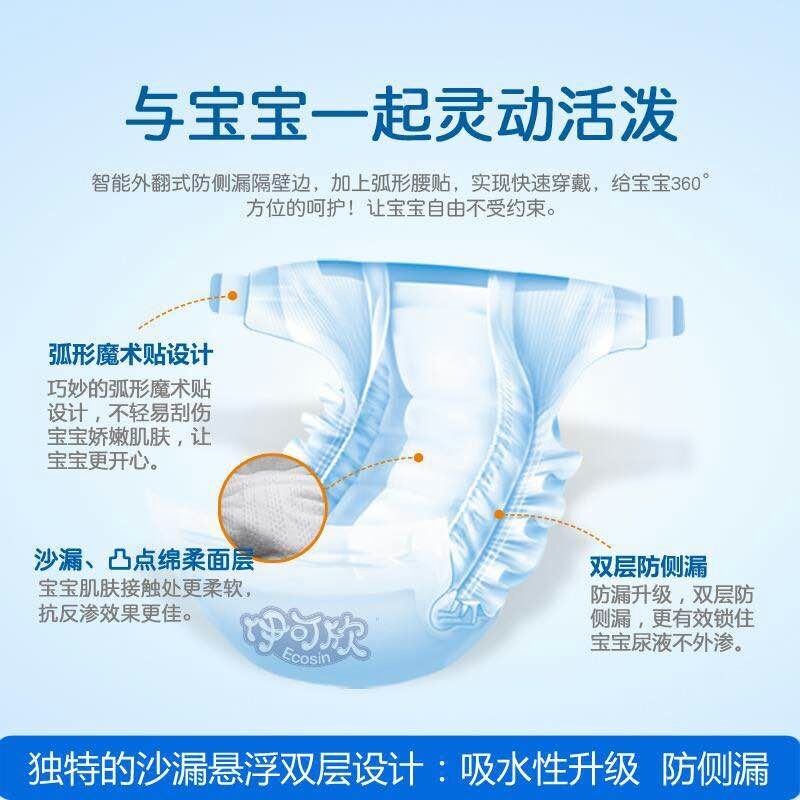 伊可欣紙尿褲產品優勢 1、柔韌彈性高腰圍 多重萊卡橡筋工藝,科學貼合寶寶腰部,松緊合身,防止后漏,讓寶寶時時刻刻都可以自在活動。 2、貼身防側漏隔邊 全自動防側漏拒水隔邊,不勒不松,貼身舒適,保證寶寶走動、安睡都不會側漏,令寶寶舒適,媽媽安心。 3、瞬吸沙漏懸浮芯 獨特沙漏懸浮芯創新科技,芯體兩側面積增加20%,加倍瞬吸的同時,自動貼合寶寶腿部,有效預防O形腿的產生。 4、超柔纖薄親膚層 優質親膚綿柔表層,天然環保、預防過敏,超柔纖薄、干爽透氣,呵護寶寶每一寸嬌嫩肌膚,有效減少紅PP的產生。