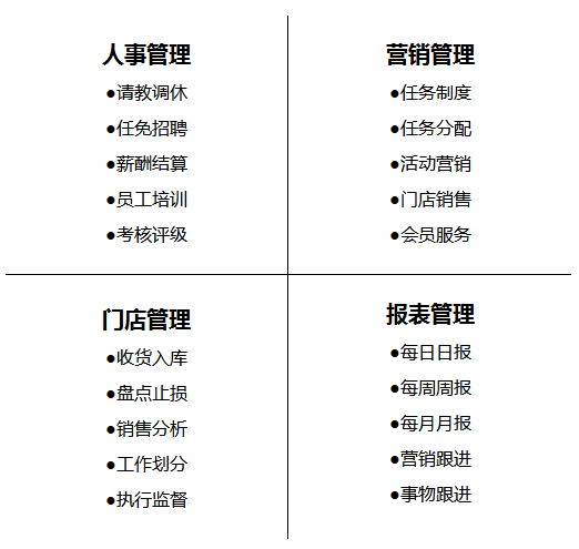 好店長能給門店帶來什么? 1、基礎工作管理 陳列管理、衛生管理、庫存管理等 2、銷售任務管理 任務制定、任務拆解、任務后續追蹤等 3、行政工作管理 員工招聘、任免、傳幫帶、員工考勤和工資結算等 4、輪休制度管理 安排輪休、代崗、調休、員工請假審批