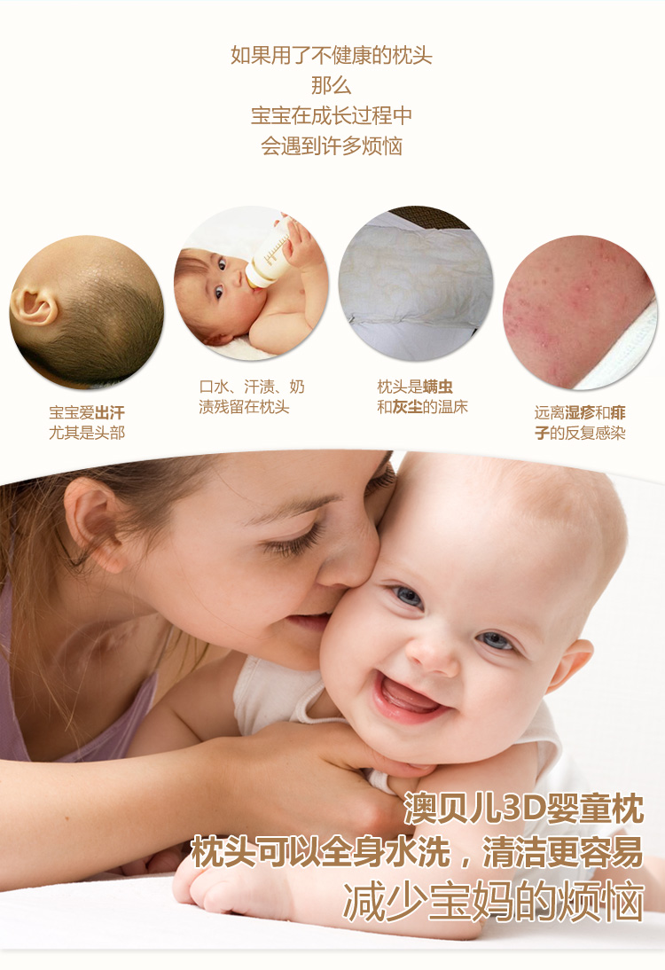 還有很多媽媽,要么是使用家里老人做的枕頭,要么就是花幾十元隨便給寶寶買個(gè)枕頭。寶寶,尤其是新生兒,每天的大部分時(shí)間都是在睡眠狀態(tài)下度過(guò)的,0--6個(gè)月的寶寶每天睡眠的時(shí)間高達(dá)16--20小時(shí),枕頭的選擇對(duì)于寶寶的睡眠質(zhì)量提升具有十分重要的作用,高質(zhì)量的睡眠是寶寶健康生長(zhǎng)發(fā)育的重要前提,如何保證睡眠質(zhì)量?塑造好頭型,好的枕頭功不可沒(méi)。這個(gè)理由足夠讓你立刻扔掉自己床上那個(gè)幾十塊的“便宜貨”,消費(fèi)升級(jí)起來(lái),給寶寶買個(gè)合適的枕頭。 寶寶的長(zhǎng)相與頭型有著密不可分的聯(lián)系,如果對(duì)枕頭使用不當(dāng),孩子的頭顱會(huì)出現(xiàn)變尖、偏、扁等各種形狀,美麗頭型也將會(huì)成為泡影!就如同外星人眼睛大,嘴巴小你絕對(duì)不會(huì)說(shuō)它美,因?yàn)樗^型大而丑。所以說(shuō),在嬰兒期媽媽一定要給寶寶塑造一個(gè)完美的頭型,塑造好頭型從選擇枕頭開始。 選擇錯(cuò)誤的枕頭,會(huì)造成嬰幼兒頭顱變形為偏、扁、尖等不良形狀的高達(dá)80%,導(dǎo)致睡眠障礙的近60%,出現(xiàn)以上情況會(huì)直接影響寶寶的智力發(fā)育及身高、體重方面的體格發(fā)育,并發(fā)呼吸不暢、打鼾、夜驚、夜啼、汗多、濕疹等癥狀,而這都是因?yàn)閶寢寣?duì)枕頭問(wèn)題重視不足、認(rèn)識(shí)不夠或盲從傳統(tǒng)枕頭方式造成的。選對(duì)真正能護(hù)型及抗菌的優(yōu)質(zhì)枕頭對(duì)寶寶的健康睡眠、腦容腔的形成、生長(zhǎng)激素的分泌、體質(zhì)的增強(qiáng)、智力及體格的發(fā)育至關(guān)重要!