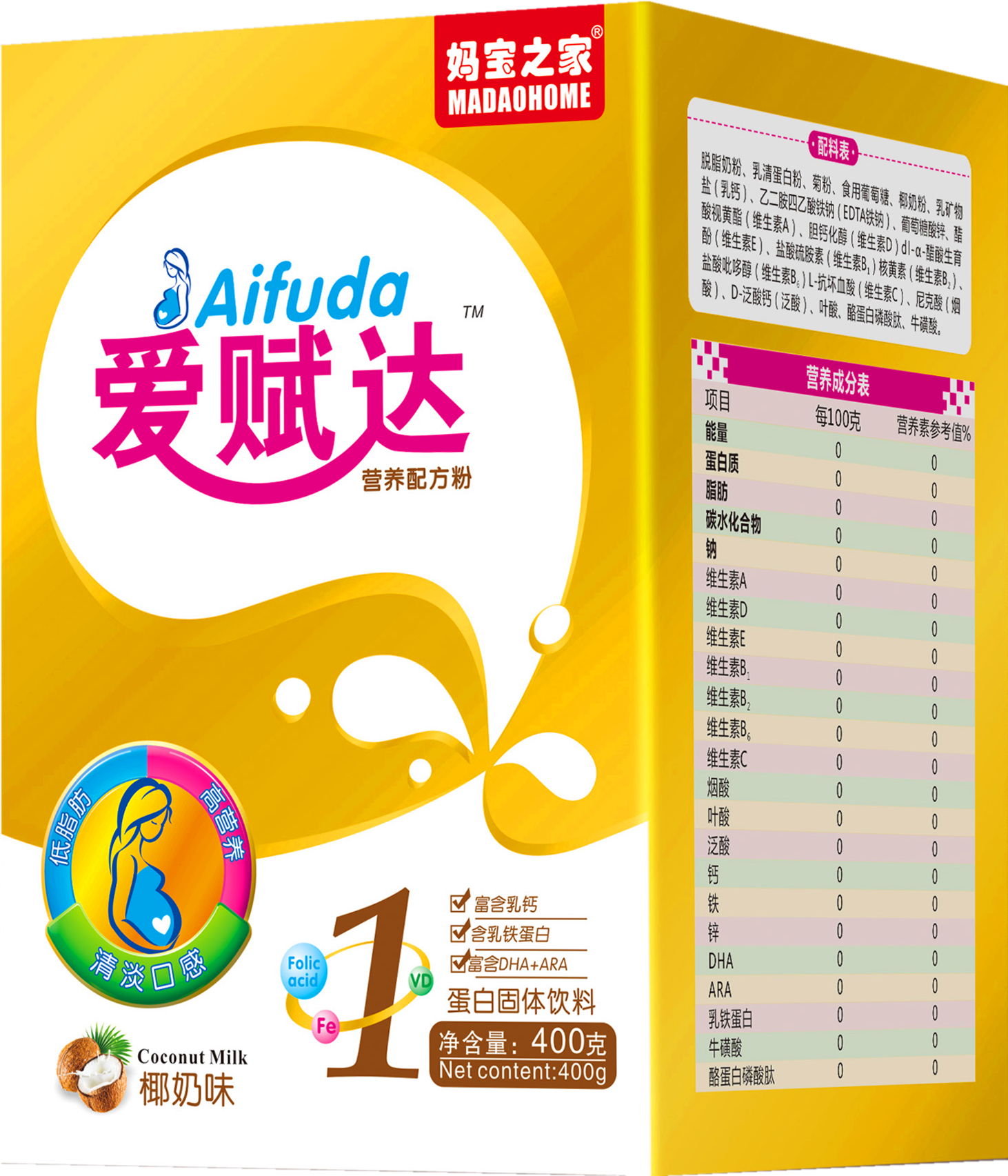 愛賦達(dá)營養(yǎng)配方粉是一款專為孕媽媽們研發(fā)設(shè)計的專屬營養(yǎng)補(bǔ)充品,有1段、2段兩種配方!而愛賦達(dá)營養(yǎng)配方粉1段正是推薦準(zhǔn)媽媽們懷孕早期(前12周)使用,它富含這一階段孕媽們所需的多重營養(yǎng),配比科學(xué),專業(yè)打造!