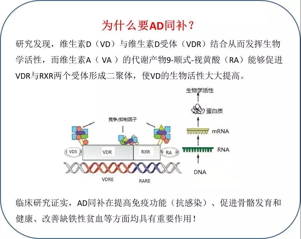 推薦新生兒從出生后開始補充維生素AD,根據(jù)《中國居民膳食營養(yǎng)素參考攝入量》中的推薦攝入量(RNI),嬰幼兒維生素AD攝入的最佳配比為:維生素A vs 維生素D為3:1,能夠同時滿足維生素A和維生素D兩種營養(yǎng)素的科學(xué)合理的攝入量。目前市售的維生素AD滴劑(伊可新),0-1歲(綠色)規(guī)格含維生素A 1500IU,維生素D 500IU;1-3歲(粉色)規(guī)格含維生素A 2000IU,維生素D 700IU。每天一粒是安全的、有效的、合理的劑量,也是《中國國家處方集(兒童版)》推薦的預(yù)防劑量。