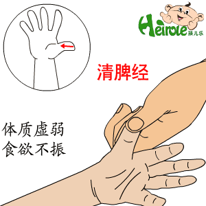 清脾經:用左手捏住孩子的手,右手指腹循大拇指側邊緣向掌根方向直推