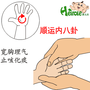 順運內八卦:內八卦在手掌面,以掌心為圓心,以掌心到中指根橫紋處距離的2/3為半徑,做圓圈形按揉。