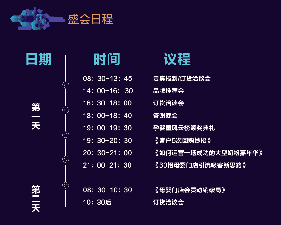 盛會看點(diǎn) 訂貨洽談——眾多知名廠家品牌展示,讓您零距離找到優(yōu)質(zhì)好產(chǎn)品 聽課學(xué)習(xí)——聆聽5大課程,提升經(jīng)營方法,解 決經(jīng)營難題 行業(yè)交流——500多家母嬰同行精英齊聚,交心交朋友營造圈子 風(fēng)云榜單——揭曉2018-2019年度風(fēng)云榜單,定位發(fā)展方向 盛會特邀嘉賓
