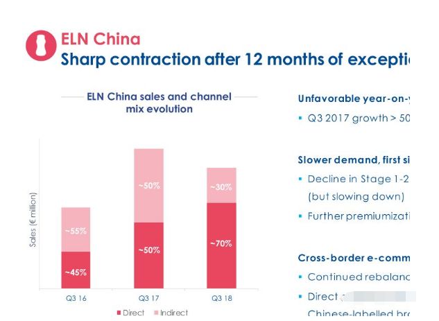 2、嬰配中國市場的銷售額下降20% 而財報期內,達能在中國市場嬰幼兒配方奶粉業務的下滑更是讓達能全球的業績“雪上加霜”。在投資者分析會上,達能方面披露,僅今年第三季度,達能在中國市場的嬰兒配方奶粉銷量就下滑了20%。而這個數據在上年同期為同比增長50%。 對于中國市場主線增速下降,達能在財報給出原因: 一是由于新生人口增長下降,市場需求增速放緩就明顯表現出來,1-2段奶粉需求下降,3段奶粉保持增長;除此之外,特配粉保持較快增長。 二是,跨境電商銷售遭遇壓力,代購商業務調整,銷售銷售出現大幅下降,在達能中國整體銷售占比下降。 國家食藥監總局推進的嬰幼兒配方乳粉產品配方注冊制要求,境外公司 2018 年 1 月前生產的嬰幼兒配方乳粉,可進口并銷售至保質期結束,其后生產的產品需要取得注冊。