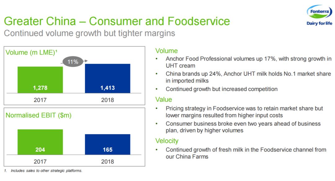 2018財年,恒天然大中華區消費品牌和餐飲服務的銷售同比增長了11%,由相當于12.78億升等量液態奶,增長至相當于14.13億升等量液態奶。 具體而言,在消費品牌業務上,2018財年,恒天然大中華區的銷量同比增長24%,由上一財年的相當于1.12億升等量液態奶,增長至相當于1.39億升等量液態奶。