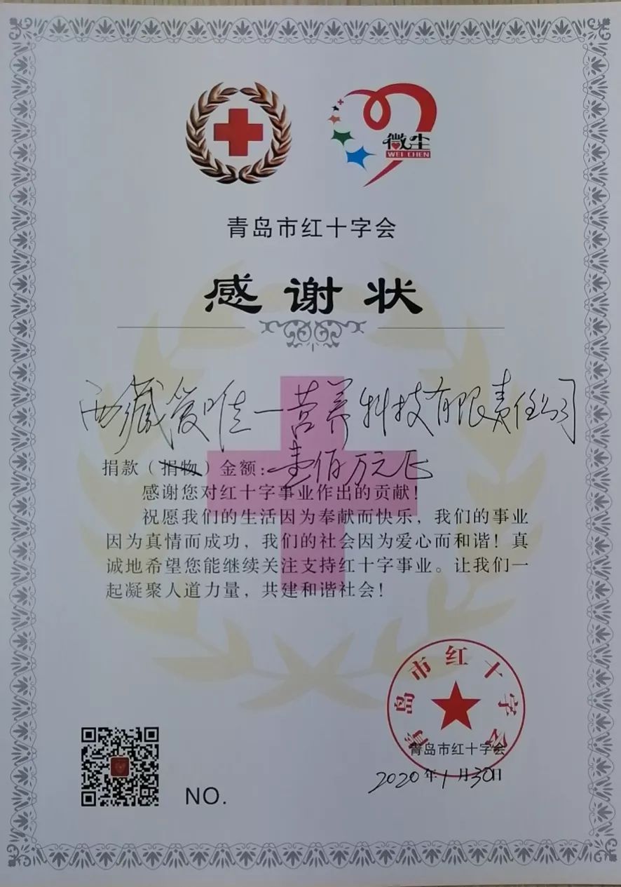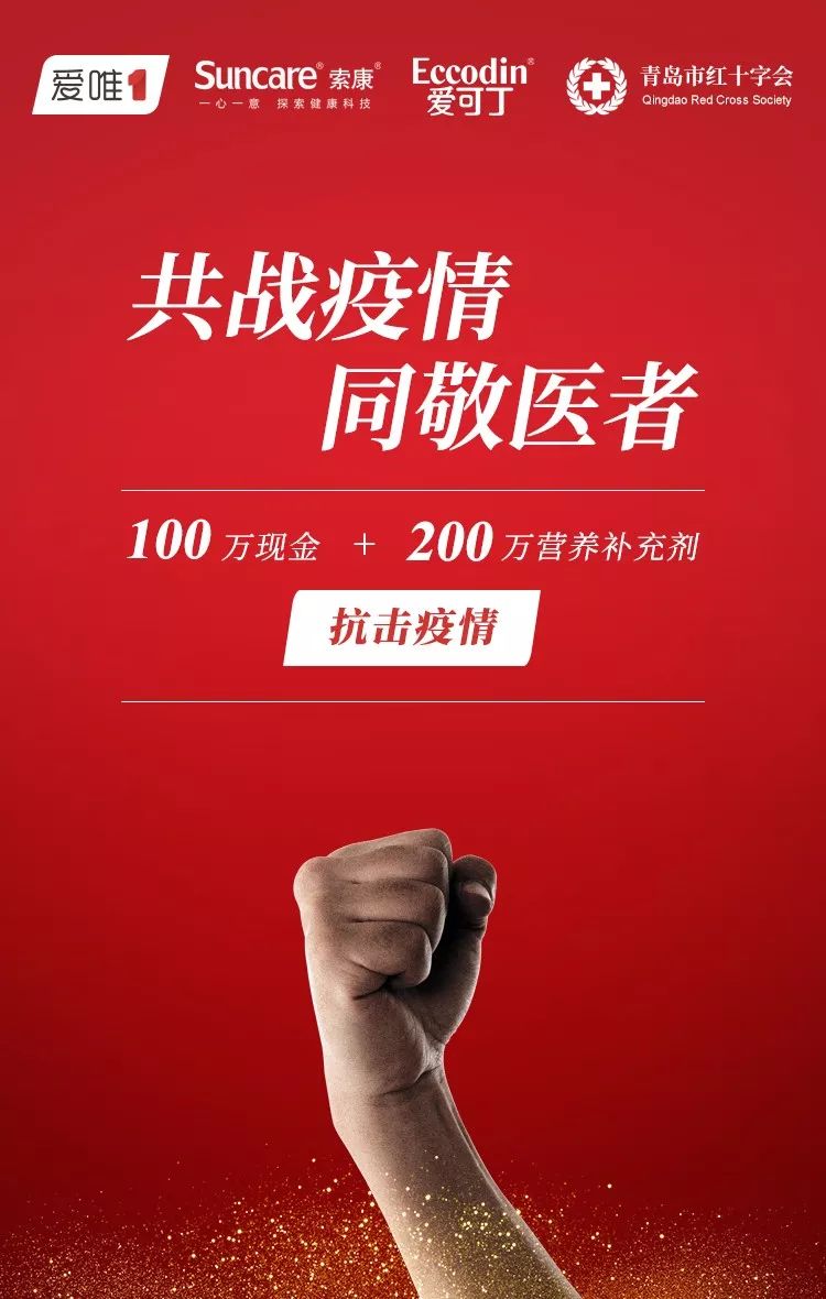 為支持抗擊疫情,2020年1月30日,索康愛可丁奶粉攜手愛唯一啟動(dòng)捐贈(zèng)計(jì)劃,向青島紅十字會(huì)捐贈(zèng)現(xiàn)金及營養(yǎng)補(bǔ)充劑共300萬。 其中,100萬元人民幣已于1月30日匯款至青島紅十字會(huì),用于購買防護(hù)服、口罩、消毒液等醫(yī)療防護(hù)用品等。 價(jià)值200余萬元的營養(yǎng)補(bǔ)充劑將根據(jù)需要用于白衣天使等辛苦工作在戰(zhàn)役一線人員及家屬使用。
