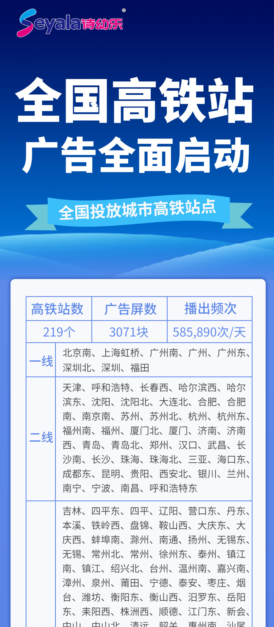 2019年1月28日至2月10日春運期間,詩幼樂宣傳廣告將覆蓋全國219個城市高鐵站點,播出頻次高達58萬次/天。全國高鐵站內(nèi)隨處都能發(fā)現(xiàn)詩幼樂的身影,而詩幼樂也將在全國219個城市高鐵站點陪伴大家回家過年哦~