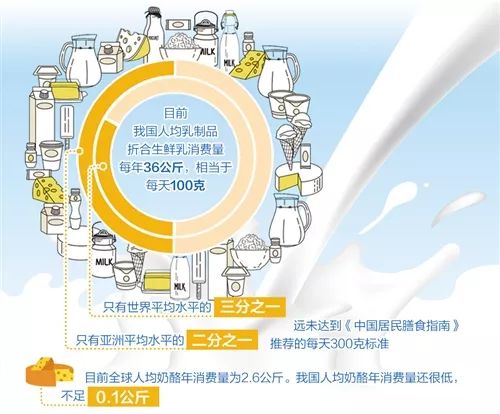 從生鮮乳到奶酪,有這樣一組數據。目前,我國人均乳制品折合生鮮乳消費量每年36公斤,相當于每天100克,遠未達到《中國居民膳食指南》推薦的每天300克標準,只有亞洲平均水平的1/2、世界平均水平的1/3;我國人均奶酪年消費量不到0.1公斤,是世界平均水平的1/26。尤其是青少年乳制品消費量與國外有較大差距,乳制品提高青少年身體素質的作用尚未充分發揮。