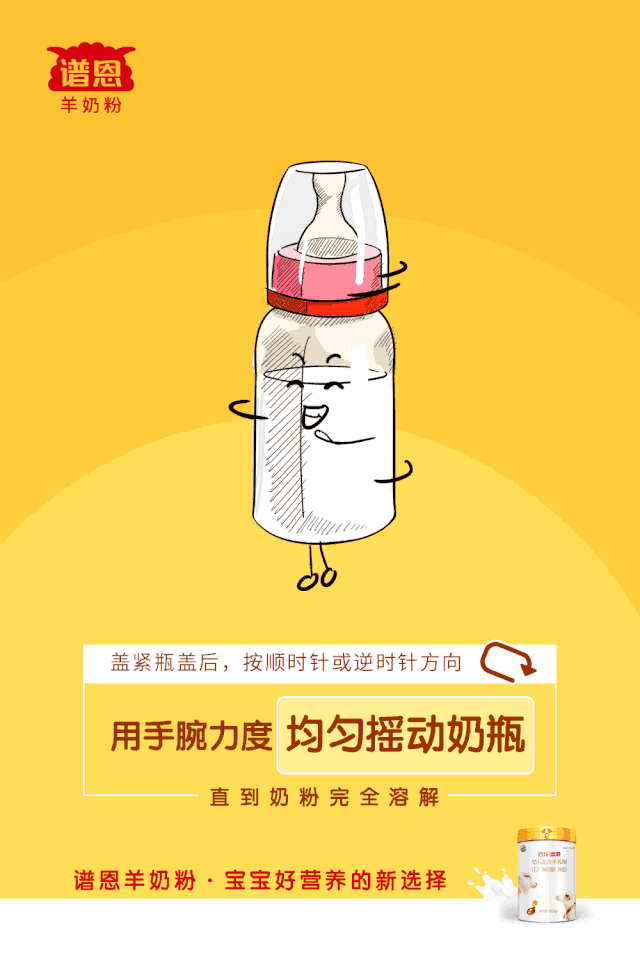 4、蓋緊瓶蓋后,按順時針或逆時針方向用手腕力度均勻搖動奶瓶直到奶粉完全溶解