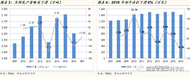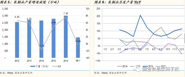 國內生鮮乳產量同比下滑,下游乳制品產量增速相較去年放緩 上游方面,7 月單月生鮮乳產量同比 -3.8% ,環(huán)比上月 -3.0%,我們預計主要是由于夏季較為炎熱以及存欄下滑的因素所致。預計今年前七月生鮮乳產量累計下滑 1% ,隨著國內規(guī);翀稣急鹊牟粩嗵岣撸磥韲鴥壬r乳產量的波動幅度將減小。