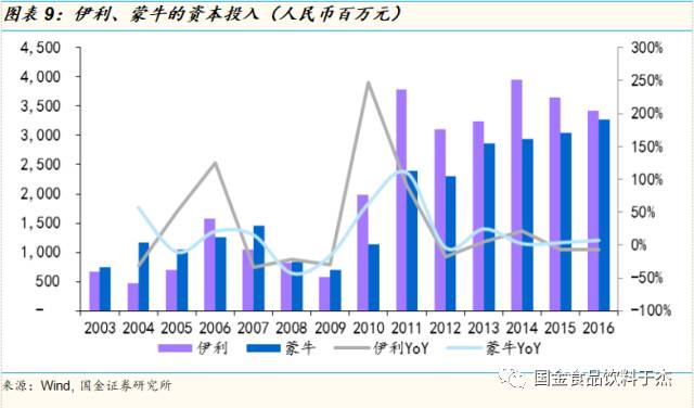 2010 年開始,伊利的資本開支開始大幅高于蒙牛,我們認為這和伊利一直以來加強奶聯(lián)社+自有牧場建設是分不開的,而蒙牛則打出“輕資產”牌,依靠第三方奶源,著力于自身強大的營銷模式在前期迅速占領市場。蒙牛近年來也開始加強自身奶源建設,生物資產投入逐年增加,而伊利由于轉讓了優(yōu)然牧業(yè)股權,生物資產大幅減少。