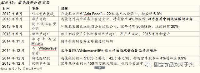 海外布局蒙牛早于伊利 相比伊利,蒙牛的拓展海外計劃開展更早,背靠中糧集團產業(yè)鏈和影響力優(yōu)勢,蒙牛海外布局大多為引進海外戰(zhàn)略聯(lián)盟,同時國內收購其他品牌以補全自身上游、低溫奶以及奶粉方面的短板。