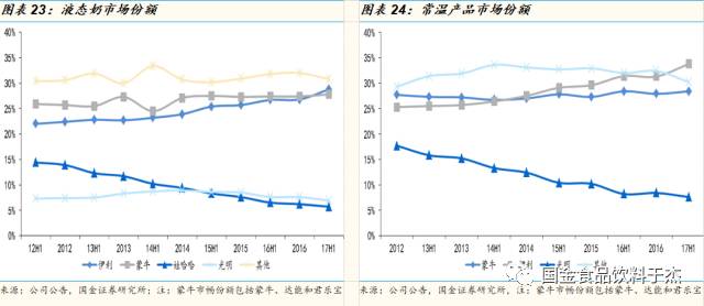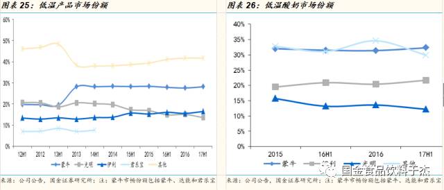 而兩家終端市場的市占率數據方面,各家咨詢機構數據不盡相同?傮w來說,伊利在常溫產品領域領先于蒙牛,而在低溫產品領域蒙牛受益于君樂寶和達能的低溫酸奶優(yōu)勢,領先于伊利。