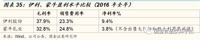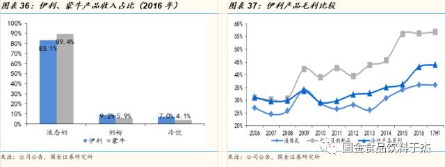 蒙牛收入更集中于液態(tài)奶,伊利高毛利產品占比較高 2016 年伊利毛利率達 37.9% 高于蒙牛的 32.8% ,我們認為主要是由于: 1)伊利奶粉收入占比高,2016 年占總收入的 9.1% vs 蒙牛的 5.9%,而奶粉的毛利率較高:伊利奶粉板塊毛利達到 56.2% ,遠高于液態(tài)奶總體的 37.9% ,而蒙牛旗下的雅士利 2016 年毛利達 47.1% ,不含雅士利蒙牛毛利則下降至29.6%; 2)伊利牛奶飲品銷量領先:根據歐睿的數據,終端伊利牛奶飲品銷售額約為蒙牛的兩倍,由于牛奶飲品原料多為大包粉,我們預計毛利和冷飲相似,毛利率超 40% ; 3)伊利高毛利液態(tài)奶產品占比高:伊利液態(tài)奶業(yè)務中我們估測高毛利產品約占液態(tài)奶總體銷售額的 50%,而蒙牛的明星品牌(特侖蘇,冠益乳等)+機會品牌(純甄等) 2016 年銷售占比約為 45% 。