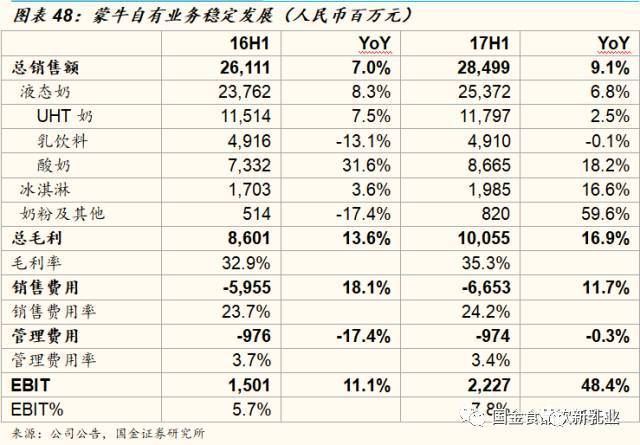 今年隨著產品結構的逐漸優(yōu)化,公司上半年的毛利率同比 +1.9ppt 至 35.6% (不包含現代牧業(yè)),預計隨著上游供應協(xié)同進一步順暢,毛利率有望繼續(xù)提升,對沖部分包材和運輸費用上升的成本。而費用方面,銷售費用投放目標更為集中有效,管理層預計蒙牛主體銷售費用率不會超過 2016 年 25% 的水平。在毛利提升以及銷售費用投放增效的作用下,17H1 蒙牛的 EBIT 利潤率同比 +2.1ppt 至 7.8% ,若剔除去年上半年約 3.15 億的大包粉拋售損失,EBIT 利潤率同比 +0.8ppt ,EBIT值同比 +23% ,利潤水平恢復顯著。
