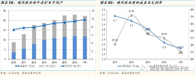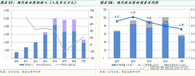 (2) 提升經營效率,降本增效,加強利潤水平 ▪ 公司將集中招投標,盡快規(guī)范中央招投標操作,致力于節(jié)省費用; ▪ 借用達能和Arla的經驗,在各事業(yè)部單元提升供應鏈效率,控制成本; ▪ 對標同行,提升生產端的效率。 (3) 更有效利用國內外上游資源 ▪ 集中采購原奶和大包粉; ▪ 國內加強對高質量原奶奶源的控制,以發(fā)展高端UHT奶和低溫奶; ▪ 幫助現代牧業(yè)發(fā)展下游液態(tài)奶業(yè)務,從而提升蒙牛在中高端市場的市占率; ▪ 站在全球的視角開發(fā)上游原奶資源。 (4) 聚焦明星產品,推動各個品類的產品升級 ▪ 品牌建設:加強與國際品牌的合作,提升品牌國際化進程;通過贊助真人秀或者其他高質量娛樂節(jié)目提升品牌知名度; ▪ 研發(fā)與創(chuàng)新:充分利用3大研發(fā)中心,積極地開發(fā)新品、改進老品;注重營養(yǎng)開發(fā),融入產品;通過開發(fā)高附加值的產品,達到持續(xù)健康的發(fā)展; ▪ 梳理產品線:制定高端化產品策略;聚焦明星產品,最優(yōu)化產品組合。 (5) 推行“深度分銷”策略,加強渠道中的競爭力 公司將致力于把各區(qū)域子公司轉變?yōu)槔麧欀行,增強任責機制和管理體系;同時穩(wěn)定經銷商體系,發(fā)展直銷以加強對終端市場的控制能力。具體措施包括:平衡經銷商、銷售公司和事業(yè)部; ▪ 進一步下沉至下線城市; ▪ 通過大數據采集、差異化市場策略以及和零售商合作,增強對KA的管理; ▪ 注重便利店、校園、餐飲以及電商等特殊渠道的開發(fā); ▪ 加強對電商平臺的建設,保持領先地位等。 我們認為蒙牛改革效用明顯,今年乳制品行業(yè)增速主要集中于三四級及農村城市消費的升級,而公司在此層級的渠道效率不如伊利。蒙牛在去年高基數、大區(qū)經理更迭以及減少基礎白奶的促銷的大背景下,17H1 依然能維持 8% 的收入增速,進一步說明了聚焦高端品、提升供應鏈效率以及提升利潤率改革成果的顯著。我們看好蒙牛改革的持續(xù)推進所帶來的體制效率的提升,隨著旗下現代牧業(yè)和雅士利的重新布局,蒙牛有望進一步拉進和伊利的差距。 現代牧業(yè):增強上游原奶供應協(xié)同效應,蒙牛欲進軍巴氏奶業(yè)務 截至目前,若不考慮可轉債影響,蒙牛持有現代牧業(yè) 60.8% 的股權。截至今年上半年現代牧業(yè)共運營 26 個牧場,奶牛 22.3 萬頭。2016 年全年原奶外銷總量 85.5 萬噸,收入占比達 69.6%,其中超 70% 的外銷原奶供給蒙牛。今年上半年現代牧業(yè)虧損 6.66 億元,虧損幅度較去年同期繼續(xù)擴大,主要是由于:(1)原奶價格同比下滑 11%,(2)蒙牛強制要約、注銷尚未實行股權以及管理層股權產生虧損;(3)應收賬款的壞賬撥備。