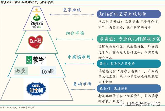 我們預計隨著嬰幼兒配方奶粉注冊制塵埃落定,行業(yè)這兩年混亂的局面有所緩解,將有利于雅士利業(yè)績的改善。8 月雅士利成為首批獲得 CFDA 配方注冊企業(yè),共有 7 個系列 21 個配方獲得注冊備案,是首批名單中獲批數量最多的企業(yè)。為了搶占注冊制+二胎釋放出來的行業(yè)空間,公司從 2016 年虧損后,著力從品牌布局、渠道銷售、供應鏈整合等方面治理改善,以迎接市場機遇。 (1)品牌方面:梳理品牌線,重新定位產品,推進差異化品牌布局 每個系列的產品不同檔次的定位,凸顯市場競爭優(yōu)勢:“雅士利”本牌側重于基礎營養(yǎng)方向,蒙牛“瑞哺恩”則治理差異化競爭,主攻有機市場;“多美滋”定位于建立專業(yè)形象,研究兒科解決方案;“Arla”作為股東戰(zhàn)略品牌,突出皇室御用概念。在地域策略上,超高端品牌“Arla寶貝與我”和中高端“多美滋”專攻一二線城市,開始滲透東部地區(qū);中高端品牌“瑞哺恩”和中端品牌“雅士利”主攻三四線市場,滲透中部地區(qū)。