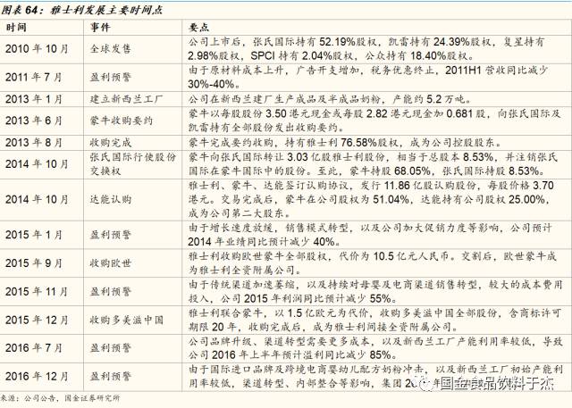 我們認為調高售價將影響部分銷量,削弱了現代牧業(yè)本來較為明顯的價格優(yōu)勢,同時把其他地區(qū)渠道開拓交給蒙牛,將削弱液態(tài)奶的毛利率。現代牧業(yè)將專注于原奶事業(yè)部,液態(tài)奶業(yè)務將不會成為未來的業(yè)務重心。現代牧業(yè)未來的業(yè)績將更加依靠原奶價格的走勢,而目前在蒙牛持股比例較高以及原料奶價格依然低迷的情況下,現代牧業(yè)今年的業(yè)績壓力較大。長期來看,蒙牛提高現代牧業(yè)的持股比例將給現代牧業(yè)帶來如下的改善機遇: (1)上游原料奶:技術協(xié)同,提高規(guī)模效應; (2)生產代工:現代牧業(yè)將以 OEM 的形式為蒙牛生產高端UHT奶和低溫; (3)營銷渠道:現代牧業(yè)將借助蒙牛的營銷渠道資源,擴大渠道覆蓋廣度和深度; (4)分銷體系:現代牧業(yè)將部分下游液奶產品賣給蒙牛的分銷商,讓他們幫助開拓現代牧業(yè)不太熟悉的華東以外的區(qū)域; (5)融資貸款:蒙?衫闷髻~上現金委托貸款給現代牧業(yè),一來蒙?梢再嵢”茹y行存款利息高些的貸款利息,二來現代牧業(yè)的借款成本降低。 未來蒙牛傾向于在高端UHT奶領域雙品牌運營(蒙牛的特侖蘇和現代牧業(yè)的“ 2 小時”),同時借助現代牧業(yè)的上游牧場優(yōu)勢,逐漸布局短板低溫巴氏鮮奶領域。 雅士利國際:注冊制順利實施,嬰幼兒奶粉業(yè)務重新起航 雅士利于 1998 年起開始專注于生產和銷售嬰幼兒配方奶粉及營養(yǎng)品業(yè)務。根據 Euromonitor 的數據,2016年市場份額約占國內嬰幼兒配方奶粉行業(yè)的 4% ,排在伊利、貝因美之后,為第三大國內品牌。 。1)進口品牌以及跨境電商的沖擊;(2)奶粉注冊制落地前的不確定性,行業(yè)內出現拋貨行為;(3)新西蘭新工廠產能利用率較低帶來成本增加;(4)雅士利品牌渠道轉型及內部整合導致費用過高,2016 年由于這四個原因,雅士利業(yè)績大幅下滑。 2016年錄得收入 22.0 億元,同比 -20.2% ,錄得歸母凈利 -3.2 億元。今年上半年公司改變銷售渠道,撤出了部分低效渠道,轉向母嬰和電商渠道,費用投入增加,疊加注冊制的不確定性影響,雅士利繼續(xù)虧損。收入同比下滑 15.7% 至 9.67 億元,毛利率環(huán)比 +3.1ppt , 而利潤端繼續(xù)虧損 1.22 億元。