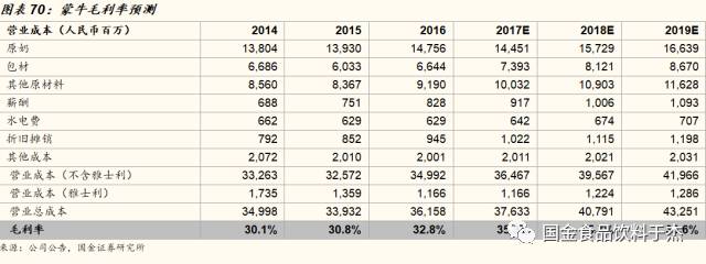 我們認為隨著規(guī)模牧場占比的提高,原奶價格波動的幅度減小,而高端產品占比的提升將繼續(xù)助推公司毛利率改善。我們預計 2017-2019 年蒙?傮w毛利率分別為 35.3% / 35.7% / 36.6% 。費用方面,預計較多高端新品將集中在年底推出,銷售費用率下半年將會小幅上升,預計 2017-2019 年整體費用率分別為 30.6% / 30.3% / 30.1% 。