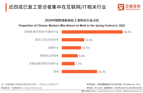 iiMedia Research(艾媒咨詢)數據顯示,互聯網/電子商務/IT/通訊行業、醫療/衛生/生命科學、金融行業為已復工受訪者人數最多的三大領域,占比分別為36.5%、13.5%、11.5%。