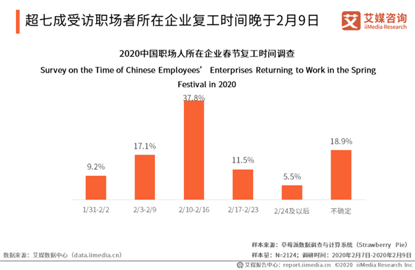 iiMedia Research(艾媒咨詢)數據顯示,26.3%的受訪職場者表示其所在企業在2月10日前已經復工,其中2月3日前復工的受訪職場者占9.2%;73.7%的受訪職場者表示其所在企業復工時間晚于2月9日。