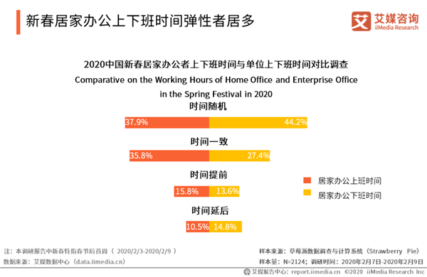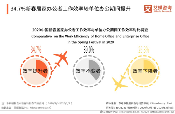iiMedia Research(艾媒咨詢)數據顯示,在辦公效率方面,34.7%的新春居家辦公者認為其效率較單位工作期間有所提升,39.0%受訪者表示居家辦公與單位辦公效率無差,26.3%的受訪者透露其居家辦公效率較單位辦公期間下降。艾媒咨詢分析師認為,結合受訪者日均工作時長來看,居家辦公效率提升者當中有62.8%的受訪者日均工作時長延長,意味著受訪者居家辦公的單位時間工作效率有可能下降。