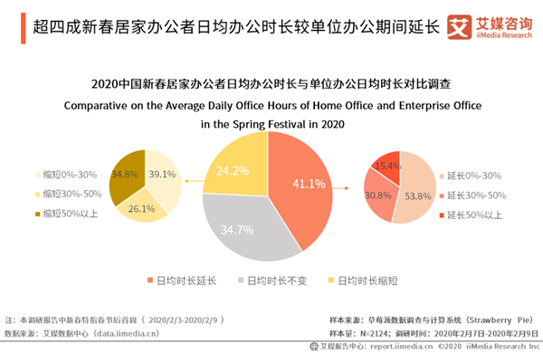 iiMedia Research(艾媒咨詢)數據顯示,與在單位辦公相比,41.1%的居家辦公受訪者日均辦公時長延長,34.7%的居家辦公受訪者表示日均時長保持不變,居家辦公日均時長縮短的受訪者占24.2%。從具體變化幅度來看,多數人時長變化幅度控制30%以內。