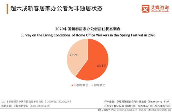 iiMedia Research(艾媒咨詢)數據顯示,2020年2月3日至2月9日,居家辦公的受訪者中有60.1%處于非獨居狀態,39.9%為獨居狀態。艾媒咨詢分析師認為,居家辦公并非中國主流辦公模式,多數職場人尚未養成居家辦公的習慣,尤其在非獨居狀態下,受到干擾的可能性較大,對工作效率會造成一定影響。