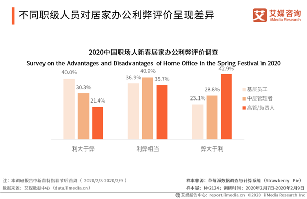 iiMedia Research(艾媒咨詢)數據顯示,40.0%受訪基層員工認為居家辦公利大于弊,40.9%受訪中層管理者認為居家辦公利弊相當,42.9%受訪高管/負責人認為居家辦公弊大于利。艾媒咨詢分析師認為,各方利益不盡相同,是導致不同職級人員對居家辦公利弊評價存在差異的主要原因。多數高管/負責人出于對員工個人效率、相互協作效率及公司商業機密等多種因素的顧慮,更傾向認為居家辦公弊大于利。