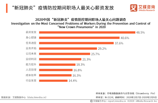 iiMedia Research(艾媒咨詢)數據顯示,在“新冠肺炎”疫情防控期間,受訪職場人較為關注的三個問題分別是薪資發放、身心健康、任務進度,占比分別為48.5%、40.6%、37.6%。
