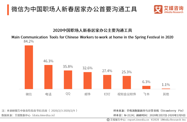 iiMedia Research(艾媒咨詢)數據顯示,中國職場人新春居家辦公期間使用的溝通工具,排在前三位的分別是微信、電話、QQ,占比分別為84.2%、46.3%、35.8%。艾媒咨詢分析師認為,微信覆蓋人群廣、用戶習慣使用等特點是其成為首要溝通工具的主要原因。