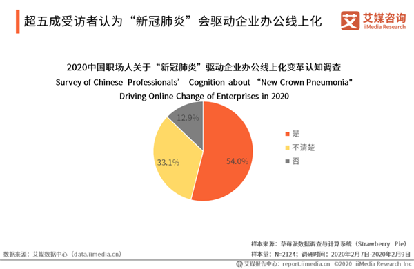 iiMedia Research(艾媒咨詢)數據顯示,54.0%的受訪職場人認為“新冠肺炎”會驅動企業辦公線上化發展,僅12.9%的受訪職場人持相反態度。艾媒咨詢分析師認為,“新冠肺炎”防控期間,大量企業采取線上辦公,為教育和培養大眾線上辦公創造了良好契機,但企業線上辦公常態化還有賴于線上辦公軟件市場的成熟發展,從當前情況來看,企業線上辦公道阻且長。