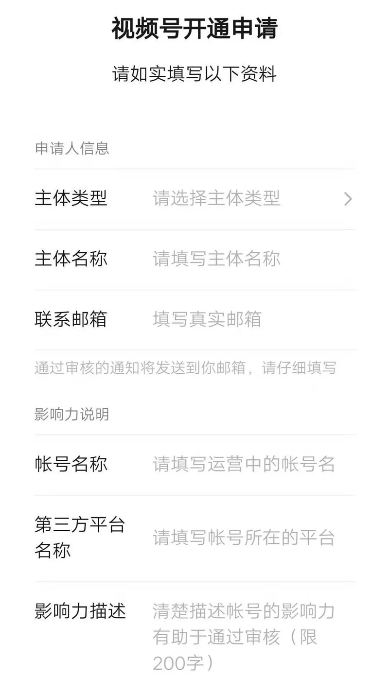 不過,想要申請「視頻號」也是有著條件的!前面的申請人信息不用我多說,最重要的還是要填寫第三方運營中的賬號、名稱和影響力證明等。 比如快手、抖音,頭條等等這些短視頻平臺的證明都可以,沒有的話小伙伴們可以去可以去注冊一個,隨便發(fā)表一些視頻,畢竟視頻號的目的還是吸引一些優(yōu)質(zhì)的短視頻自媒體入駐的。
