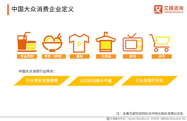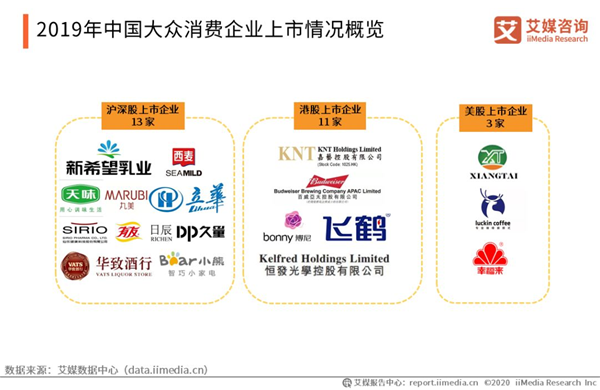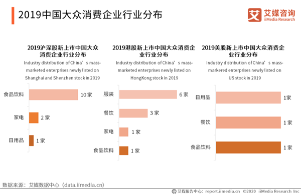 iiMedia Research(艾媒咨詢)數據顯示,2019年合計27家中國大眾消費行業公司首次公開招募,其中14家企業在港股及美股市場上市,但上市首日破發的企業高達9家,且近年在境外市場退市的中國大眾消費企業也較滬深股更多。境外資本市場較為寬松的條件吸引上市企業選擇,但對于企業自身而言,核心競爭力提升才是關鍵。 (《2019中國大眾消費企業IPO分析報告》完整高清PDF版共33頁,可點擊文章底部“閱讀原文”進行報告下載) 本報告研究涉及企業/品牌/案例 新乳業,西麥食品,天味食品,丸美股份,立華股份,有友,日晨股份,華致酒行,小熊家電,中國飛鶴,瑞幸咖啡,新諾威,久量股份,仙樂健康,三只松鼠,嘉藝控股,植華集團,百威亞太,博尼控股,幸福來,優品360,太興集團,利華控股集團,香態食品,登輝控股,賞之味 2019年共27家大眾消費企業IPO,超四成為食品飲料企業。2019年滬深股、港股、美股累計有27家大眾消費企業IPO,其中44.4%為食品飲料行業企業。互聯網和新零售發展趨勢下,大眾消費企業發展受到沖擊,在產品和業務創新上表現較好的食品飲料企業資本市場更進一步。 大眾消費企業境外資本市場表現欠佳,2019年上市首日破發企業達9家。2019年在港股和美股上市的中國傳統消費企業達14家,而上市首日破發的高達9家。境外資本市場上市條件相對更為寬松,也成為近年上市企業的市場選擇,但對于企業而言,自身競爭力提升才是關鍵。 市值領漲港股企業居多,漲幅前十企業七成來自服裝行業。2018-2019年市值漲幅排名前十的企業中,境外上市企業高達7家,其中6家為港股企業。行業方面,市值漲幅前十企業中七成為服裝企業,其余三家均為食品行業企業。 報告節選內容 中國大眾消費企業定義 本報告主要對食品飲料(飲料、食品)、服裝(服裝、服飾與奢侈品)、超市(多元化零售)、日用品(家庭與個人用品)、家電(家用電器)和餐飲(餐館)六大行業為主的傳統消費企業在滬深股、港股、美股三大資本市場情況進行研究分析。