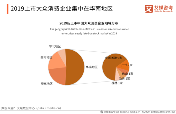 2019上市大眾消費企業集中在華南地區 數據顯示, 上市的中國大眾消費企業集中分布在華南南部地區一二線城市。共計14家處于華南地區的大眾消費企業成功上市,其中9家為中國香港企業,4家為廣東省企業。艾媒咨詢分析師認為,華南地區具有傳統的輕工業優勢,在食品飲料、家用電器領域有深厚的歷史基礎,再加上和華南地區科技創新水平較高,為大眾消費企業不斷注入新活力。