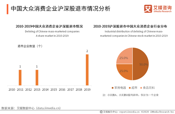 中國大眾消費企業滬深股退市情況分析 數據顯示, 2010-2019年間,在滬深股有4家中國大眾消費企業退市。其中,2019年退市企業2家,退市的企業以家用電器企業為主。艾媒咨詢分析師認為,在新型智能家電產品以及家電零售模式的沖擊下,傳統家用電器企業迎來挑戰,發展愈加嚴峻,技術及運營模式轉型升級迫在眉睫。