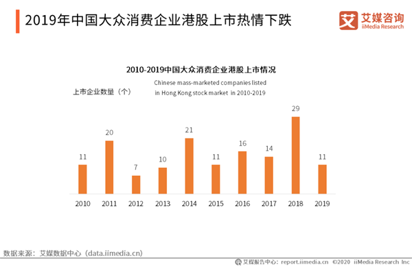 2019年中國大眾消費企業港股上市熱情下跌 數據顯示, 2018年中國大眾消費企業在港股上市熱情高漲,2010-2019年中國大眾消費企業港股上市波動較小。艾媒咨詢分析師認為,隨著中美貿易摩擦的加劇,香港股市也將會面臨一定的波動風險,未來短期內中國大眾消費企業在港股上市將會變得更加謹慎。