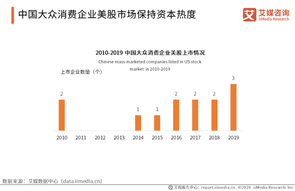 中國大眾消費企業美股市場保持資本熱度 數據顯示, 2010-2019年以來在美股上市的中國大眾消費企業并不多,僅有13家企業;近幾年,中國大眾消費企業選擇在美股上市的熱情有所回升。艾媒咨詢分析師認為,對于瑞幸咖啡等新興企業,選擇在美股上市有利于較為迅速地獲得融資,實現快速發展。大眾消費企業在美股上市整體呈現出上升趨勢,未來預計會有更多企業選擇在美股上市。