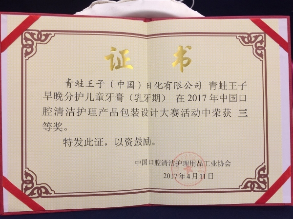青蛙王子早晚分護兒童牙膏榮獲中國口腔清潔護理產品包裝設計大賽三等獎