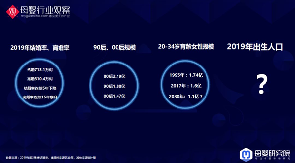 《2019母嬰行業(yè)觀察年終報告》,再見2019·回答 1、首先我們來回顧下2019年的關鍵詞大事件,每一個大事件發(fā)生的背后,都是一些行業(yè)發(fā)展、趨勢、或者變革的印證,比如國產(chǎn)奶粉行動提升方案的發(fā)布、飛鶴上市、人口出生問題熱議等。我們今天的第一部分內(nèi)容,也是圍繞2019年母嬰人都在關注的一些問題展開。 這一年,全社會關注的新生兒出生人口怎么樣了? 2019年的出生人口一定是下降的,下降多少我們不做具體的預測了,過兩天權威部門會發(fā)布。這個數(shù)量下降之前我們往前看,有三組數(shù)據(jù)可以跟大家分享:1)2019年的結婚率和離婚率:700多萬結婚,有300多萬離婚,結婚率連續(xù)5年下降,離婚率連續(xù)15年攀升;2)80后到00后數(shù)量下滑的非常嚴重;3)20-34歲育齡女性的規(guī)模下滑的非常嚴重。這意味著以后的出生人口一定下降的,沒有逆轉的大因素出現(xiàn),這個趨勢還是往下走的。