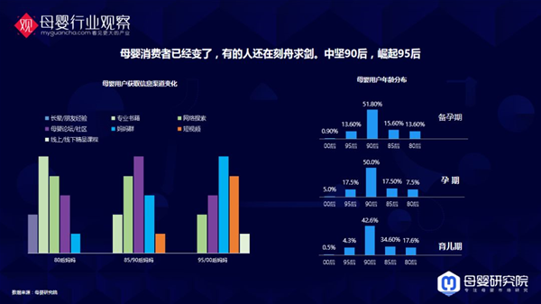 這一年,90后、Z世代、00后正在決定品牌未來嗎? 80后、85后、90后、95后、00后媽媽信息獲取渠道已經(jīng)發(fā)生了很大的變化,95/00后媽媽,短視頻和微信群是她們獲得信息的第一第二途徑,80后是完全不一樣的,她們還去搜索,看專業(yè)書籍。同時我們看到在備孕期、孕期和育兒期,90后和95后已經(jīng)是絕對的中堅主力。