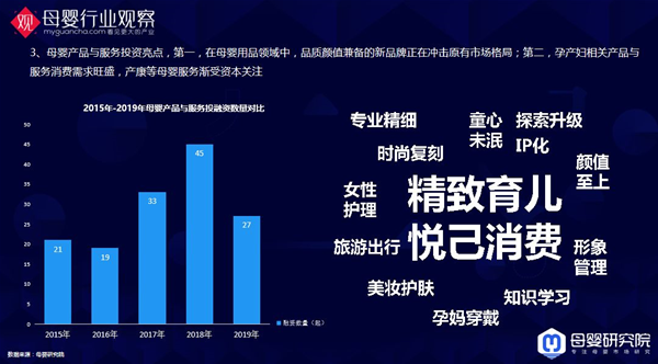 同時我們看到母嬰產(chǎn)品和投資服務的亮點,第一品質(zhì)顏值兼?zhèn)涞男缕放普跊_擊原有市場格局,這里的代表企業(yè)babycare,幾年的時間幾乎把自己在做的類目重做了一遍,而且得到了消費者很大的認可。第二,孕產(chǎn)婦相關產(chǎn)品與消費服務需求旺盛,很多企業(yè)是增長非常快的,還有產(chǎn)康服務,這個領域里面的企業(yè)像藍絲帶做的非常好,資本都在關注他們。